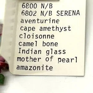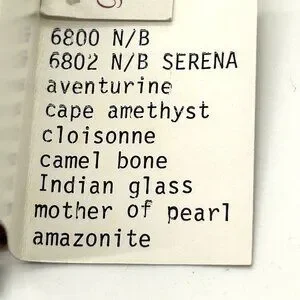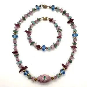 The Gretchen of La Jolla set was created by Gretchen Jaenicke, who lived in La Jolla, California. This versatile set includes a necklace and bracelet made from natural stones and glass beads, featuring a pink cloisonné bead as the centerpiece. Additionally, the set can be connected to form a longer necklace.