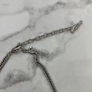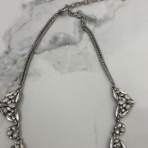 This stunning silver necklace features intricate filigree patterns with elegant butterfly-like shapes, creating a captivating statement piece. The symmetrical design and bright silvery finish make it perfect for adding a touch of vintage-inspired elegance to any outfit.