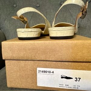 New in box! Size 37, 7. These cream flats from Anthropologie feature a sophisticated pointed toe and a textured finish, perfect for adding elegance to any outfit. The open back with a slingback strap offers a chic and modern touch, making them ideal for both formal and casual occasions.