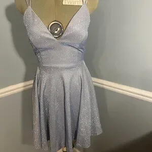 Brand new with tags! This stunning light blue glitter dress from Windsor is perfect for your next special occasion. Features a flattering fit-and-flare silhouette, double spaghetti straps, and subtle sparkle throughout. The deep V neckline and open back with criss-cross straps add a touch of drama and elegance.