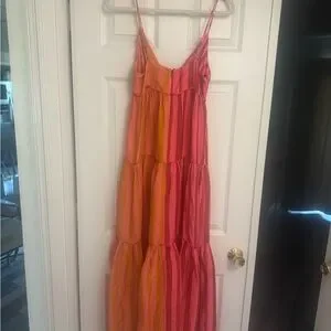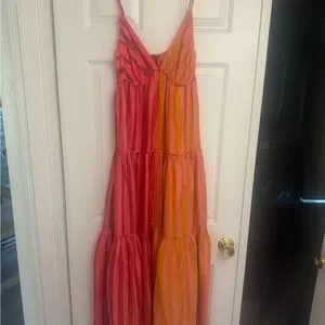 Embrace the vibrant spirit of resort wear with this stunning FARM Rio maxi dress, featuring a pleated, tiered design in captivating pink and orange hues. The sleeveless sundress boasts a spaghetti strap neckline with a plunge, offering a breezy and elegant look perfect for casual outings. Its flowing silhouette and ankle-length cut make it an ideal choice for warm weather adventures.