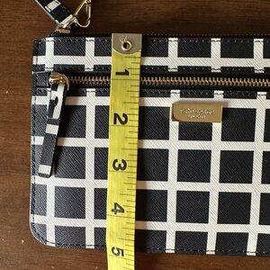 Stylish and chic, this Kate Spade wristlet features a classic black and white checkered design. Perfect for carrying essentials with ease and elegance.