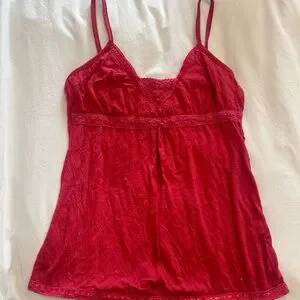 stylish red cami top with delicate lace trim. perfect for layering or wearing alone. so cute for the summer straight from the 2000s!! brand is one step up. labeled as a medium but def fits more like a small to medium. looks way brighter in photos. def just needs a little ironing.