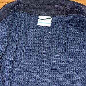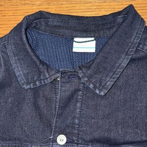 Dark blue denim with blue waffle style fabric lining. Adjustable snap cuffs.