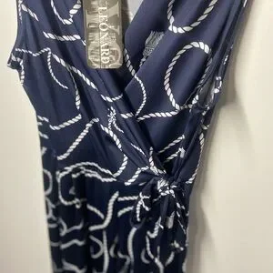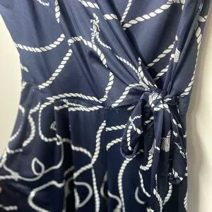 Stylish sleeveless jumpsuit. Navy with white rope pattern. V-neckline with wrap detail. Perfect for casual outings.