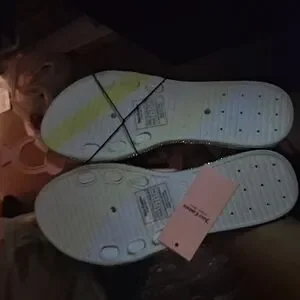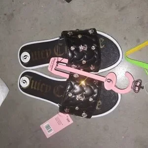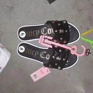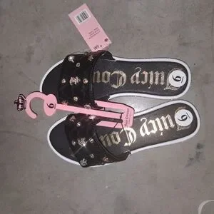 Chic black slides with quilted design. Gold embellishments add elegance. Juicy Couture logo featured prominently.