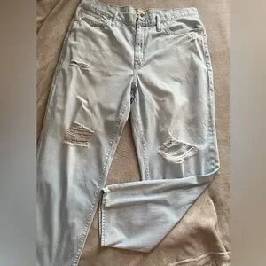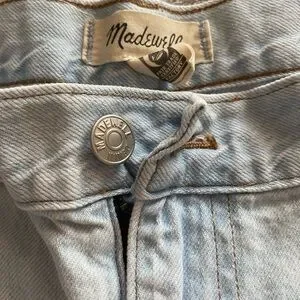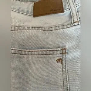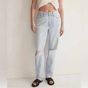 These Madewell jeans feature a straight-leg design in a timeless blue shade. The light wash and distressed elements lend a vintage charm, perfect for everyday wear. Crafted from medium-weight denim, they offer a comfortable fit with a stylish edge.