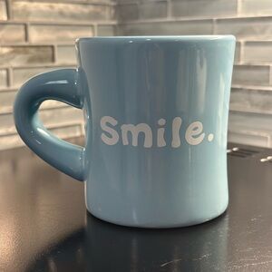 This powder blue ceramic mug is perfect for dining, featuring a cheerful 'Smile' design that adds a touch of positivity to your day. Its classic diner-style shape with a sturdy handle makes it ideal for enjoying your favorite hot beverages.