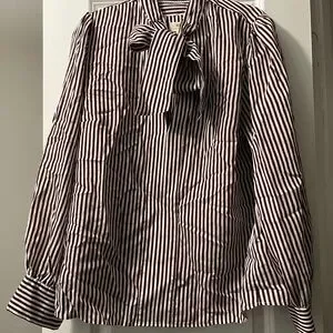 Chic striped blouse. Features a stylish bow tie at the neck. Long sleeves with buttoned cuffs. Perfect for a sophisticated look.