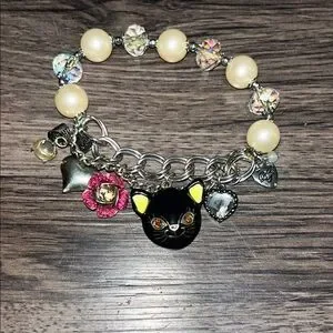 This whimsical bracelet by Betsey Johnson showcases a playful black cat charm as its centerpiece, complemented by pink accents. The bracelet is adorned with pearlescent beads and sparkling rhinestones, creating a delightful piece that adds a touch of fun to any ensemble. See photo-where there is one stone missing but that part can be removed from the bow charm. I’ve had this for about 15 years.