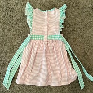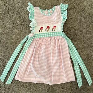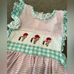 Smocked flamingo dress in pink and light green with bow ties on the sides and buttons in the back. Excellent condition, worn once. Smoke free pet free home.