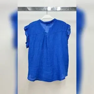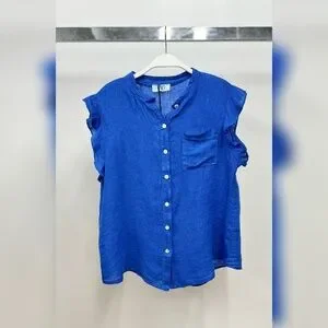 (8093-ROY) SOLID RUFFLE SHORT SLEEVE CHEST POCKET BUTTON DOWN LINEN TOP