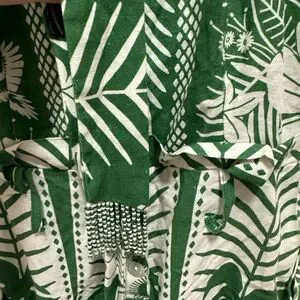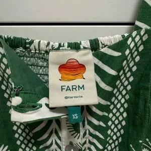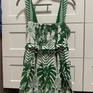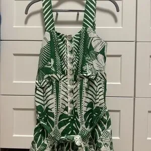 Step into a tropical paradise with this FARM Rio jumpsuit, featuring a vibrant green and white botanical pattern. The sleeveless design with wide shoulder straps and a fitted bodice offers a relaxed and comfortable fit, perfect for warm weather. Its intricate palm frond motifs and geometric elements create a bold visual impact, making it an ideal choice for sunny days.