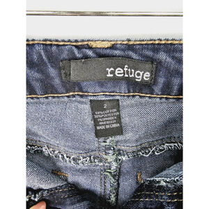These Refuge skinny jeans in size 2 feature a mid-rise waist and a dark wash color. They have a slim fit and a 28-inch inseam, making them ankle-length. The jeans are made from stretch fabric for added comfort and have a zip and button closure. Perfect for a stylish and sleek look.