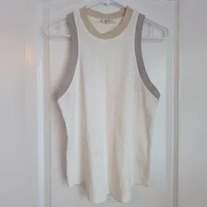 This cream tank top from We The Free features a ribbed texture and a classic sleeveless design. The contrasting tan trim adds a stylish touch to the simple silhouette, making it a versatile addition to any wardrobe.