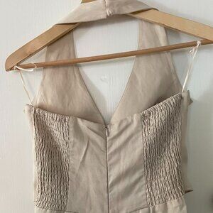 Sophisticated and sexy ASTR the Label Tatum halter neck jumpsuit featuring a fitted button-front vest and flowing wide-leg pants. EUC. Exposed midriff and open back. Tailored silhouette with smocked back detail and side pockets. Natural taupe tan color. Hidden back zipper, Lined bodice. 60% tencel, 40% linen; rayon lining. Dry clean. Size S. This ASTR jumpsuit is perfect for wine tasting, outings with the girls, festivals, and any Summer fun!!
