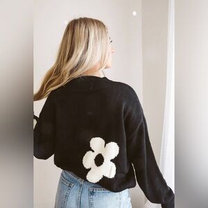 Retro… Flower Power…Black Sweater w/Large White Flowers. Has round neckline & full sleeves. Stops @ upper hips. 100% Acrylic
