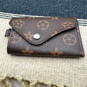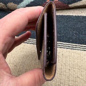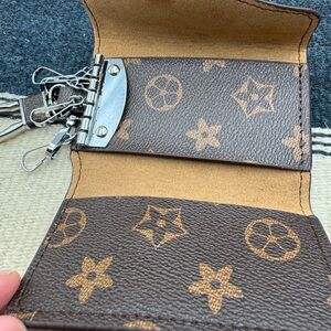 376-PTT Box 17. This product is a unisex brown PU leather key holder wallet case with a snap close feature. It includes 6 key rings and 1 additional key ring, making it convenient for organizing and carrying keys. The plain design and faux leather material give it a sleek and stylish look, perfect for both men and women. The key holder wallet case is a practical and fashionable accessory for keeping keys safe and secure. Measuring 4.25 by 3 inches.