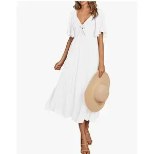 UNIQUE DETAILS: Add A Touch of Femininity to This Midi Dress with Charming Tie Front Detail, Allowing You to Adjust The Fit and Create A Flattering Silhouette. Enhance Your Style with Stylish V-shaped Neckline That Brings Attention to Your Upper Body, Womens Boho Dress Make You Look Elegant. This Swing A-line Dress with Back Smocked Feature, Offering A Snug and Comfortable Fit That Hugs Your Curves.
