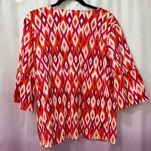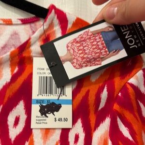 Elevate your wardrobe with this vibrant top from Jones New York. Featuring a striking red and orange pattern, this top is perfect for adding a pop of color to any outfit. Ideal for casual outings or a day at the office.
