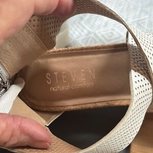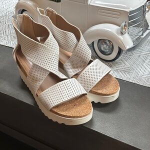These Steve Madden wedges feature a stylish crisscross design with textured white straps, offering a chic and comfortable fit. The chunky sole provides excellent support, making them perfect for everyday wear. Their neutral color ensures versatility, complementing a wide range of outfits.