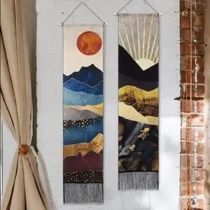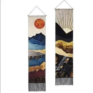 Trending indie/mandala/hippie tapestry banner & wall art! Features colorful bohemian mountain range, & full sun/sunset backdrop. Rustic vintage colors. Chic tassels line the bottom. Perfect for nature/outdoor lovers.