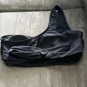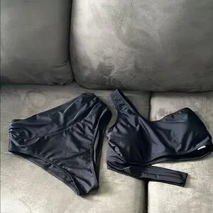 Sleek, One Shoulder, Tie in the back, black bikini set features a simple and timeless design, crafted from a shiny swimwear fabric ideal for water activities. The two-piece set includes a separate top and bottom, offering a comfortable fit and a slight sheen for a touch of elegance. NWT
