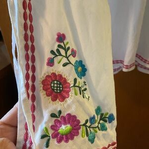 This exquisite linen type blouse by Willi Smith showcases a stunning embroidered design in white and pink hues. The bell sleeves add a touch of elegance, while the intricate embroidery enhances its bohemian charm. Perfect for a garden party or any occasion, this top is a stylish addition to your wardrobe. Size XL but a more fitted design.