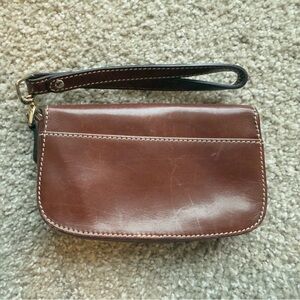 Chic leather wristlet by Dooney & Bourke. Features a stylish gold-tone logo plaque. Ideal for essentials.