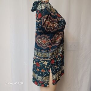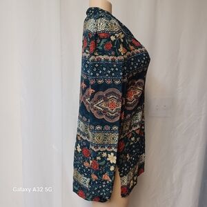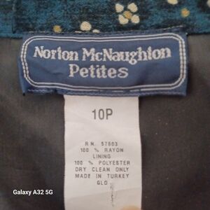 This relaxed button down shirt by Norton McNaughton features a notched collar and a harmonious blend of blue and brown hues. The long sleeves and intricate patterns lend a sophisticated touch, with shoulder pads making it a versatile addition to any wardrobe.