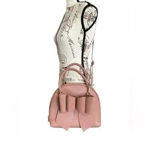 Crossi mauve or dusty rose colored faux leather purse with bow, braided handles, and gold hardware. Detachable strap allows this purse to be carried on the shoulder or crossbody