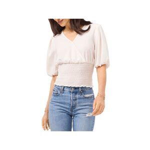 1. STATE Womens Ivory Stretch Smocked Pouf Sleeve Surplice Neckline Top S