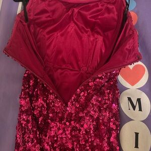 Excellent condition size 2. This dress was worn once for my prom, the prettiest strapless neckline! Perfect for a prom. For reference I am 5’7 and about 120 lbs with a 23-24 inch waist. This was professionally altered from a size 4 to a size 2.