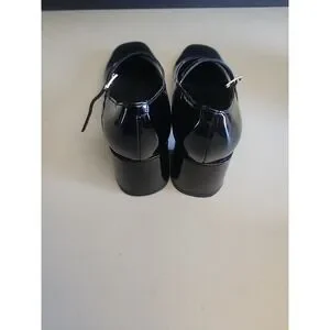 The MARC FISHER Palie Mary Jane Block Heels in faux black patent leather are stylish and chic women's shoes in size 6.5. Featuring a square toe shape, mid-height block heel, and strappy design, these heels are perfect for adding a touch of sophistication to any outfit. The patent leather upper and outsole material ensure durability and a sleek appearance, making them a versatile and fashionable choice for any occasion.