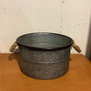 Round galvanized metal bin. Features sturdy rope handles. Perfect for storage or decor.