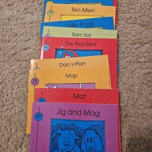 Set of colorful children's storybooks. Includes titles like 'Cam's Snack' and 'The Red Sled'. Perfect for early readers.