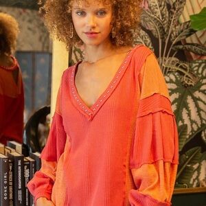 POL perfect v-neck tangerine+ red top w/stud accents+ keyhole back!