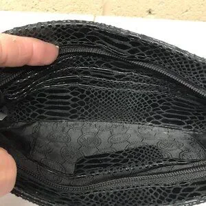 Black snakeskin print crossbody bag. Features one slip pocket inside along with 6 credit card slots and one zipper pocket. Gold hardware adorns this bag. Excellent used condition. Bag measures approximately 9.5" x 5"