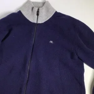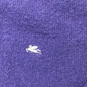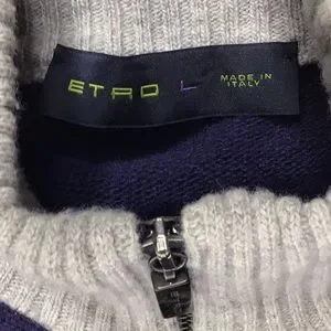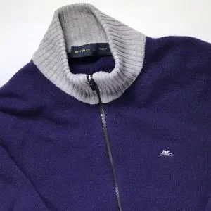 Stylish Etro sweater with a zip-up design. Features a rich purple body and contrasting gray collar. Perfect for a sophisticated look.