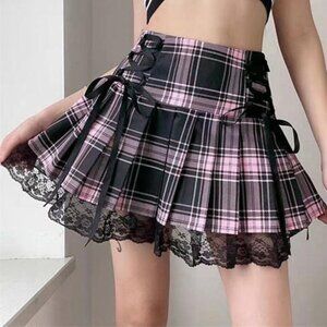 This plaid mini skirt features a pleated design, lace up accents, and lace trim along the hemline. Hidden side zip. Fabric is nice and substantial, not see through at all. Tagged an Asian size medium, measures about 14" across the waist and 14" waist to hem. Listing is for skirt only. Smoke free home but we do have pets. BIN13