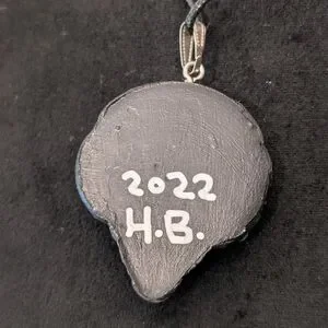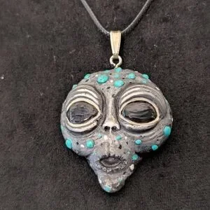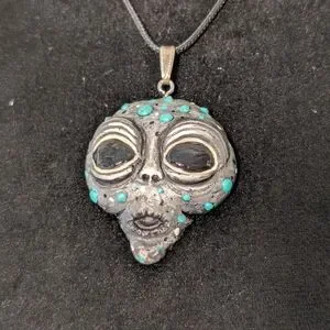 Unique alien pendant necklace featuring a striking black and silver design with turquoise accents. Perfect for adding a touch of mystery to your style.