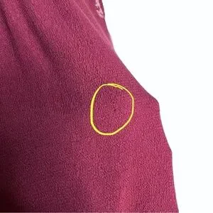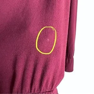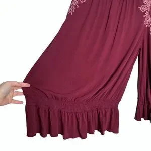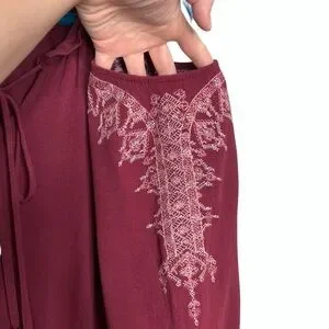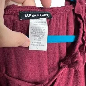 Alpha Amour Maroon Cold Shoulder Tassel Flare Sleeve Ruffle Hem Blouse. Size large. 100% rayon. In gently preowned condition with one small snag and one small hole (see circled pics). Tassel tie neck closure. Elastic at waist that leads to a flowy/ruffle hem. Flared sleeve. Embroidery at sleeve.
