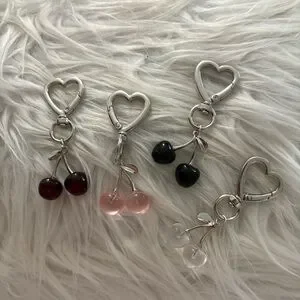 Add a playful touch to your look with this heart-shaped cherry charm. Featuring vibrant red, pink, and black cherries. Decorate your purse or back pack with this cute charm ! Price is for each individual charm. About 2 1/2 inches in length