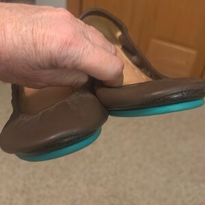 Step into elegance with Tieks' brown leather flats, designed for both comfort and style. These slip-on shoes feature a classic rounded toe and a striking teal sole, making them a versatile addition to any wardrobe. Perfect for casual outings, they offer a chic yet understated look.