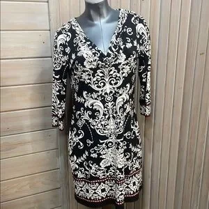 This elegant sheath dress from White House Black Market is designed for a cocktail night out, featuring a sophisticated cowl neckline and 3/4 sleeves. The black and white color scheme creates a timeless look, while the form-fitting silhouette ensures a flattering fit. Crafted from a comfortable fabric, this dress is both stylish and versatile.