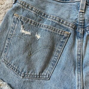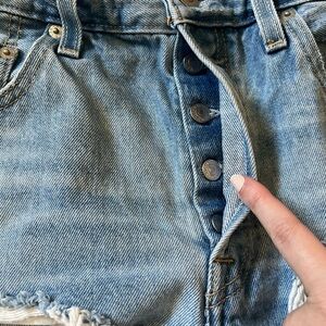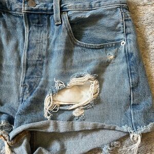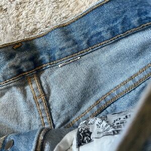 Light wash, great condition. Wear is shown in photos. Distressed with holes.