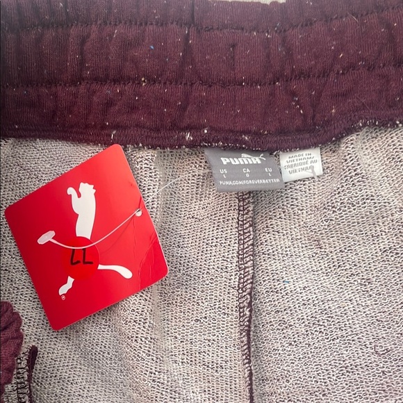 These Puma athletic shorts feature a deep burgundy color and a comfortable elastic waistband, making them ideal for both workouts and casual wear. The soft, textured fabric offers a relaxed fit, ensuring all-day comfort. A subtle logo detail adds a touch of style to these versatile shorts.