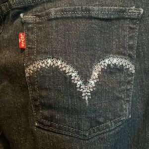 Levi’s 505 straight leg jeans size 8 M. They are a dark blue, with embroidered decor on the right front little pocket, and on both back pockets. The tag says 8 M W 29, inseam 32. Zip front closure with Levi’s logo metal button closure. There are two front pockets, with the little pocket in addition to the regular pocket on the right as mentioned before. They were hardly ever worn. The first picture shows the color best. There is stretch width wise in the fabric which leaves room for stretch in the waist. and across the legs.