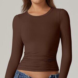 QINSEN Womens Crewneck Long Sleeve Shirt Double Lined Basic Tees Side Ruched