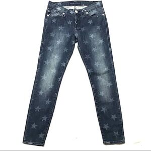 These Rock & Republic jeans feature a playful star pattern subtly embedded into the classic blue denim, offering a vintage-inspired look with a medium-light wash. The distressed detailing adds dimension, making them perfect for casual outings or a stylish night out.